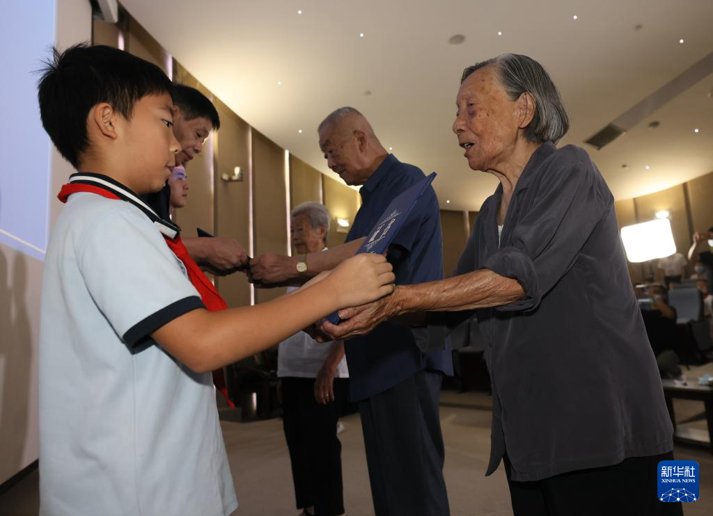 2022年8月15日,在侵华日军南京大屠杀遇难同胞纪念馆,夏淑琴(右一)向曾外孙李玉瀚颁发“南京大屠杀历史记忆传承人”证书。新华社发