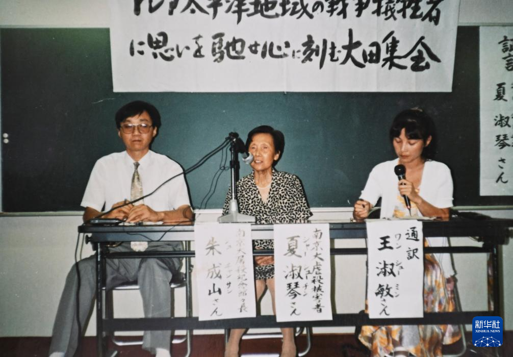 1994年8月6日,夏淑琴(中)在日本举行的集会上提供证言(翻拍照片)。新华社发pagebreak