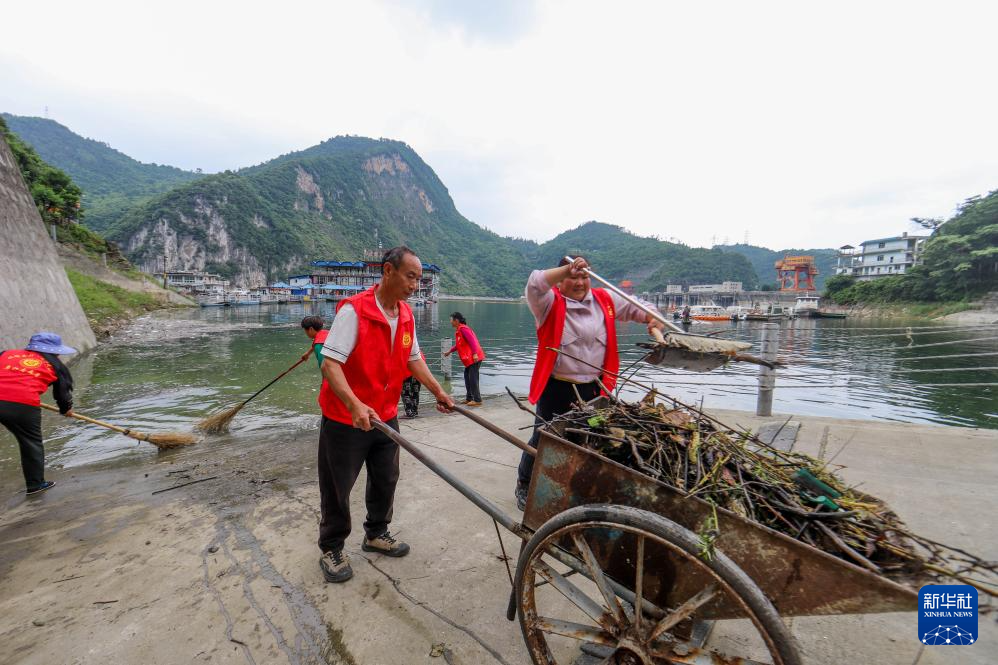 6月3日,志愿者在乌江岸边清扫垃圾。