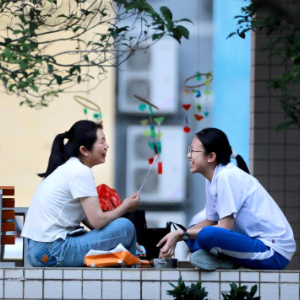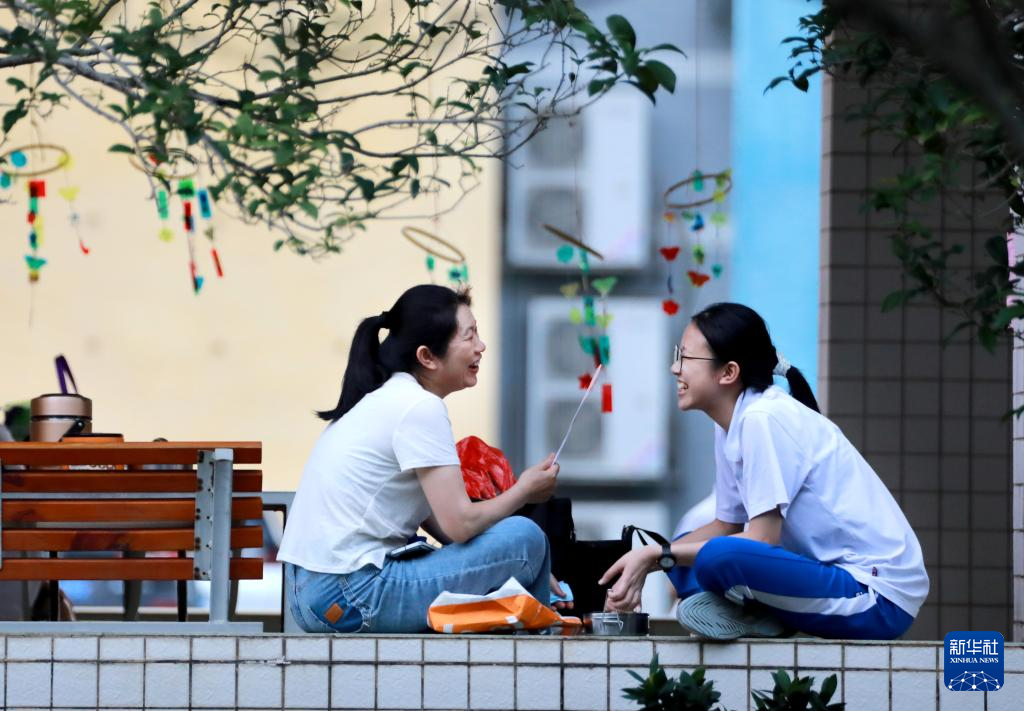 6月5日傍晚,广东肇庆中学一名高三学子在家长的陪伴下,开心享用家长送来的“爱心餐”。
