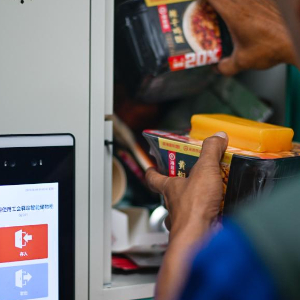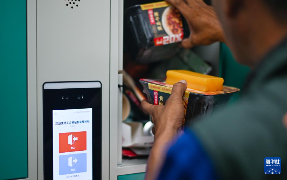 6月9日,在天津市河西区职工服务中心工会驿站,一名快递员从智能储物柜中取物品。