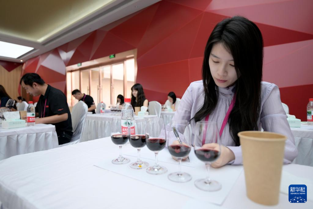 6月9日,参赛选手在比赛中对红酒进行评价。