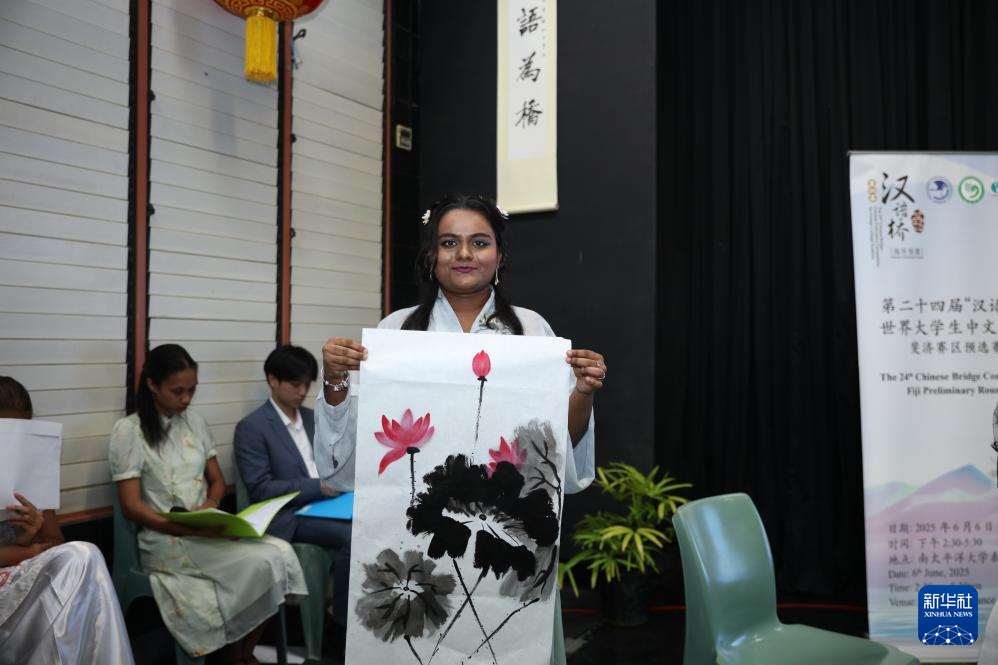 6月6日,在斐济首都苏瓦,“汉语桥”世界大学生中文比赛斐济赛区比赛的参赛选手展示中国画作品。
