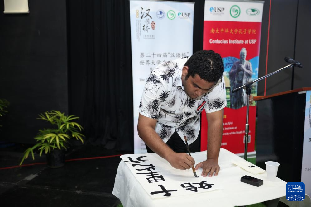 6月6日,在斐济首都苏瓦,“汉语桥”世界大学生中文比赛斐济赛区比赛的参赛选手展示书法才艺。