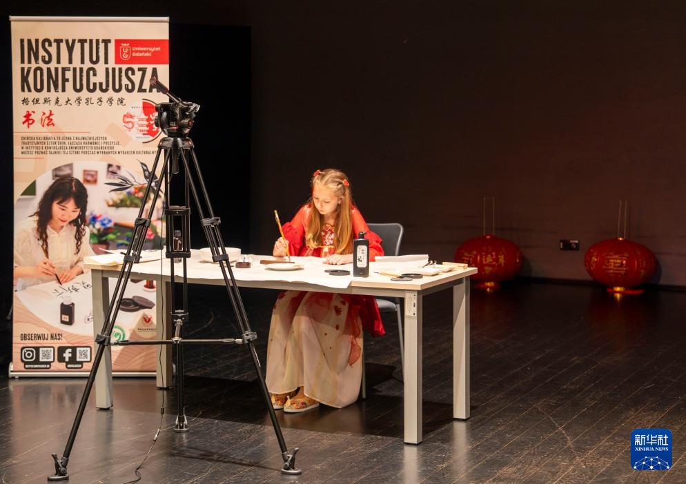 6月6日,在波兰格但斯克,参加“汉语桥”中文比赛的小学生用毛笔作画。