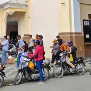 6月8日,在柬埔寨班迭棉吉省波贝市,人们等待通过柬泰边境的波贝检查站。