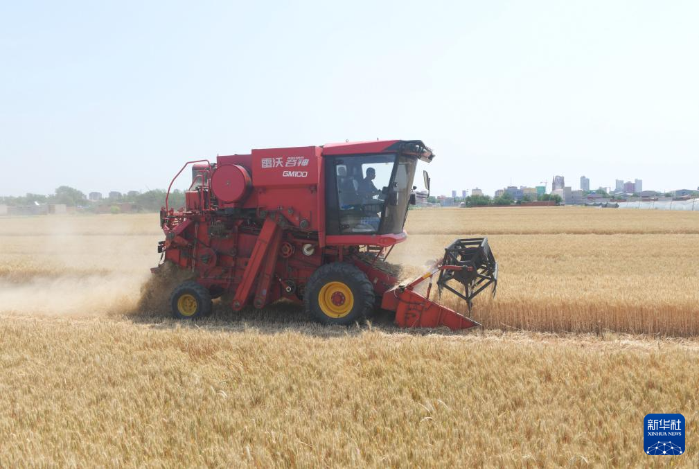 6月10日,在山东省东营市广饶县李鹊镇后里西村,农民驾驶联合收割机收割小麦。