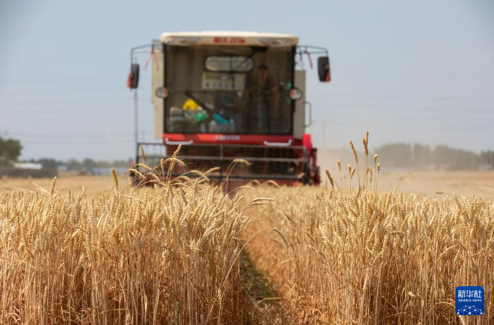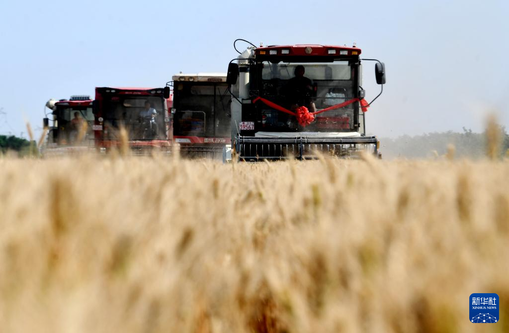 6月10日,联合收割机在河北省石家庄市栾城区柳林屯乡东牛村麦田里收割。