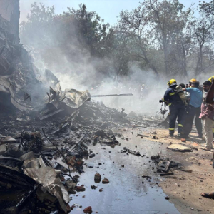 6月12日,消防员在印度古吉拉特邦艾哈迈达巴德附近坠机现场灭火。