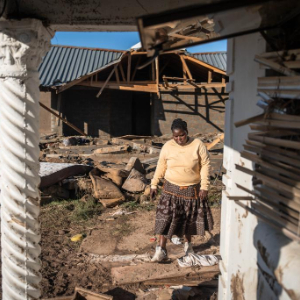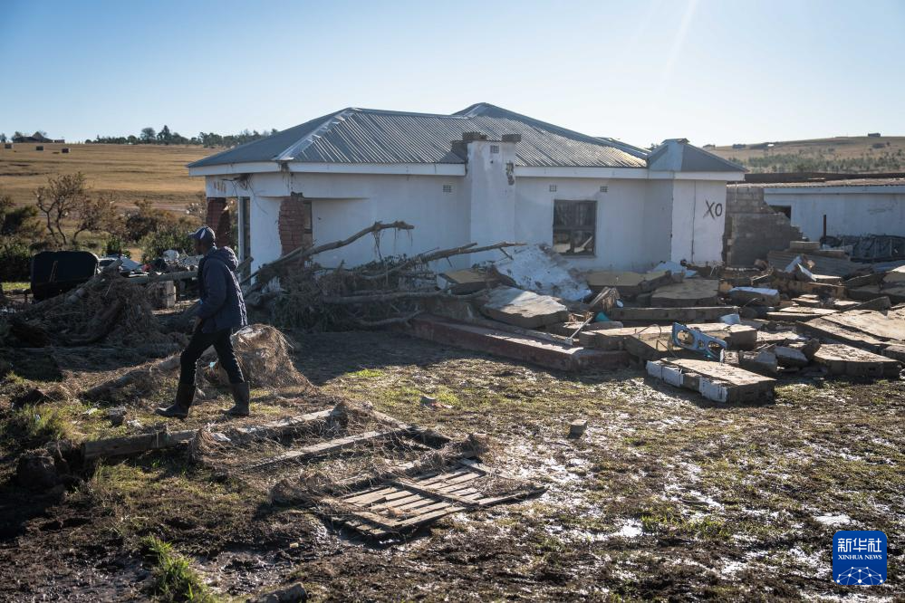 6月13日,在南非东开普省姆塔塔,一位当地居民从被洪水损毁的房屋旁走过。