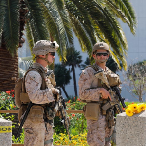 美国军方13日证实,约200名海军陆战队士兵已进驻洛杉矶。在洛杉矶联邦机构设施外,全副武装的海军陆战队士兵已开始执行警戒守卫任务。