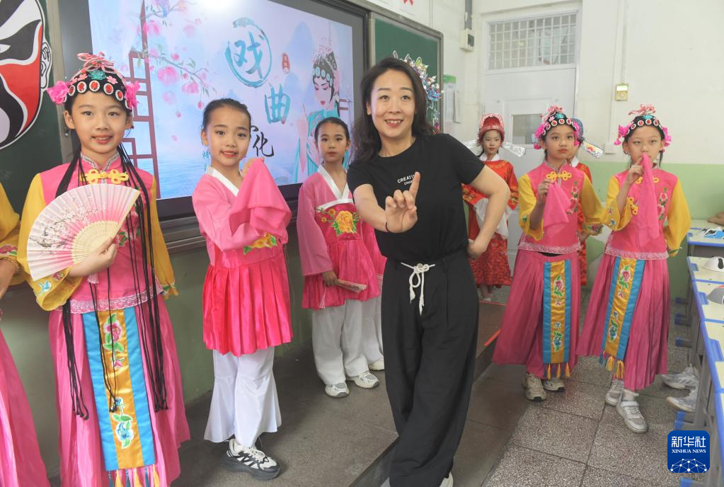 6月13日,在河北省石家庄新乐市实验小学,老师指导学生学习戏曲。