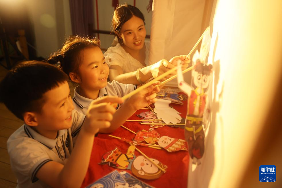 6月13日,在浙江省湖州市德清县乾元镇第一幼儿园,小朋友在老师指导下体验皮影戏。