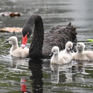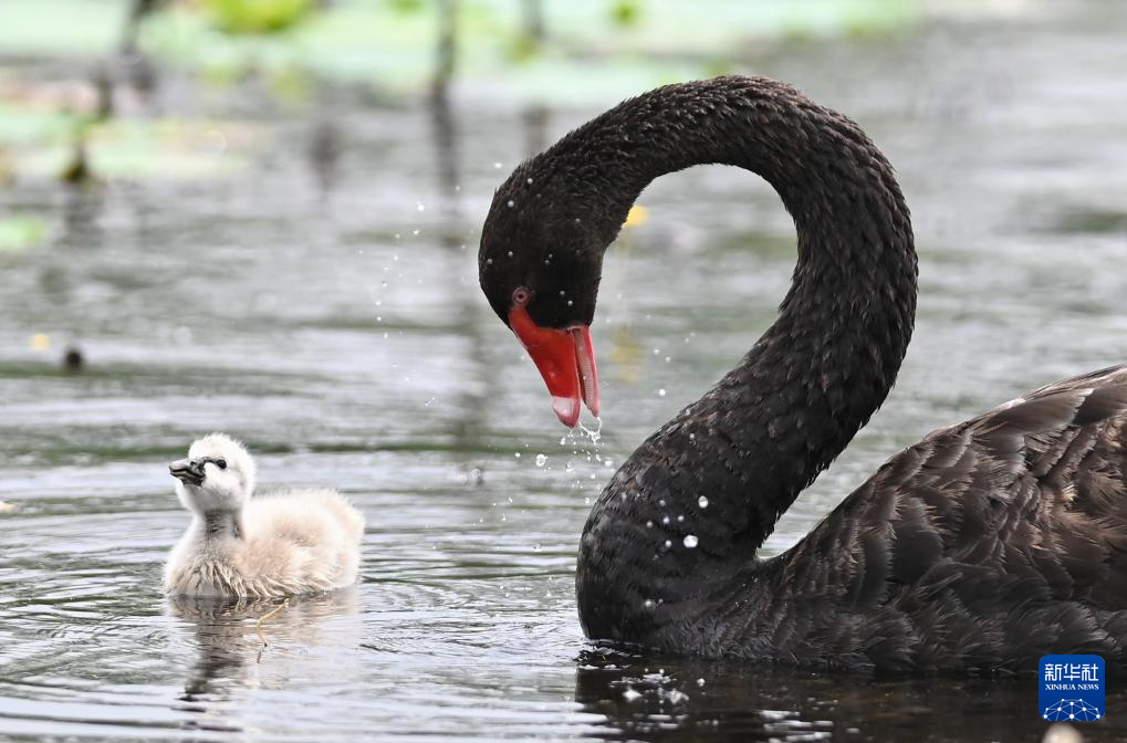 近日,在山东滕州微山湖红荷湿地景区,一对黑天鹅夫妇喜添新丁,自然繁殖的五只天鹅宝宝紧随亲鸟在水中游弋觅食。