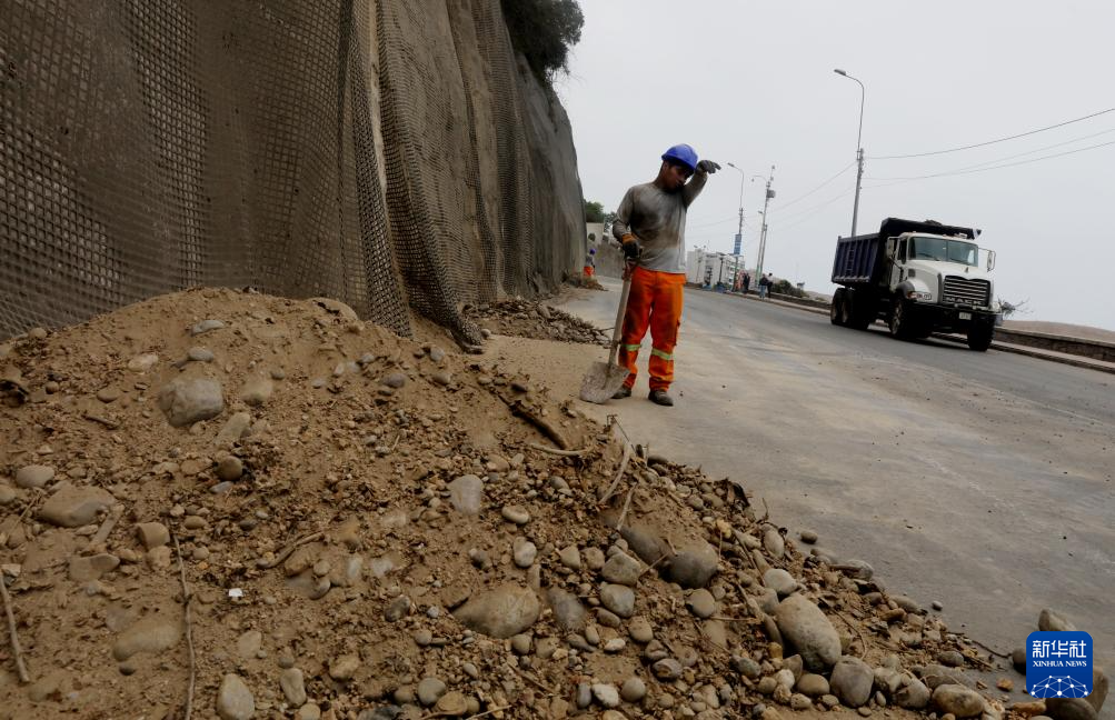 6月15日,在秘鲁首都利马,工人清理利马沿海公路旁受地震影响掉落的碎石。