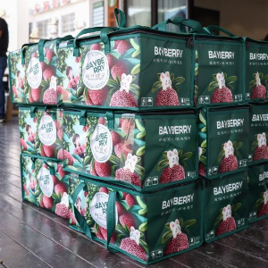 6月17日,工作人员在宁波市江北区慈城镇南联村游客中心帮助游客打包采摘的杨梅。