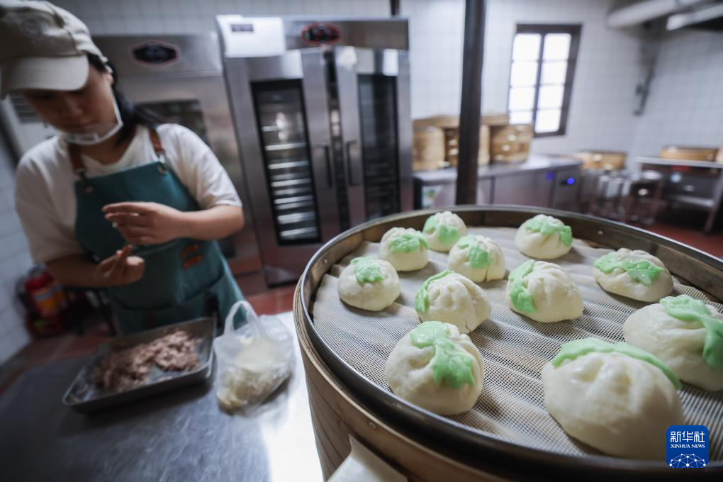 6月19日,工作人员在盐官古城潮乐之城的汪菜包子铺内包当地传统的手工包子。