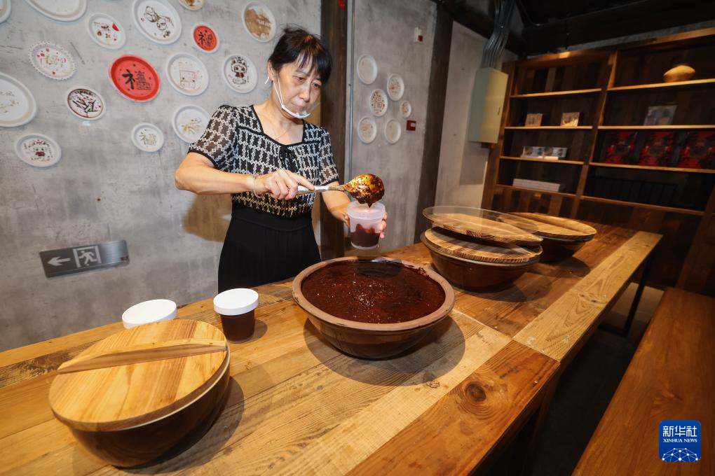6月19日,在盐官古城潮乐之城的裕丰酱园内,店员打包传统豆瓣酱。