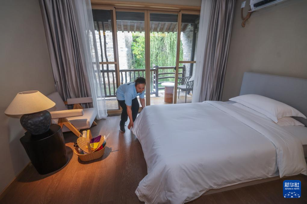 6月19日,服务员在盐官古城潮乐之城的民宿内整理房间,古城内的民宿餐饮业吸纳了大批周边村民就业。