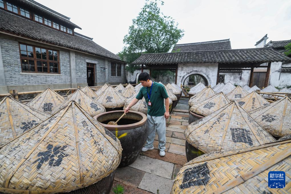 6月19日,在盐官古城潮乐之城的裕丰酱园内,店员查看露天发酵的酱油。