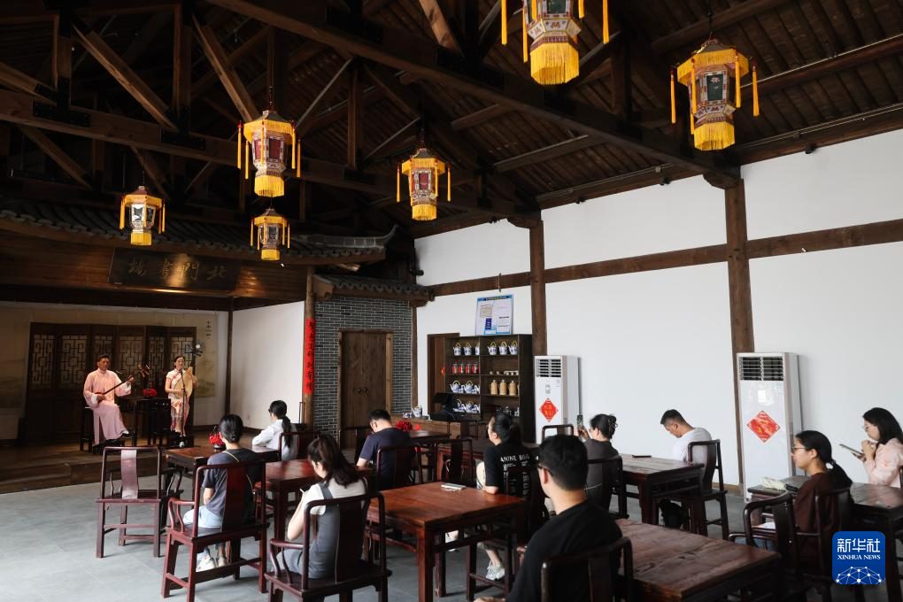 6月19日,游客在盐官古城潮乐之城观看评弹说书表演。