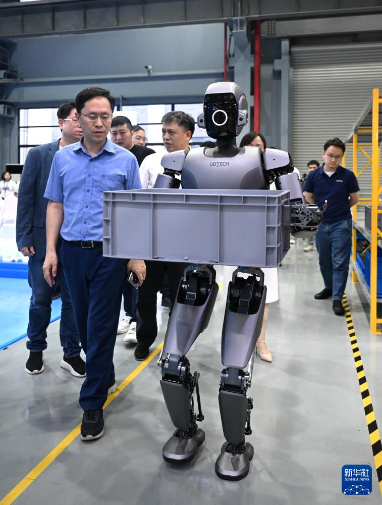 6月18日,在广西柳州市北部生态新区机器人产业园,刚下线的工业版人形机器人进行作业展示。