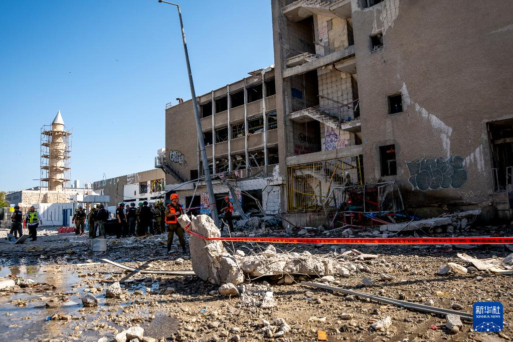 6月20日,安全和救援人员在以色列北部海法的导弹袭击现场工作。