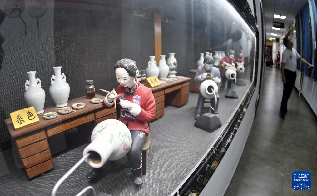 京彩瓷博物馆展示的京彩瓷制作流程陶人像(6月18日摄)。