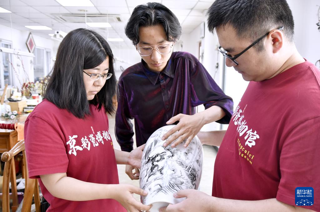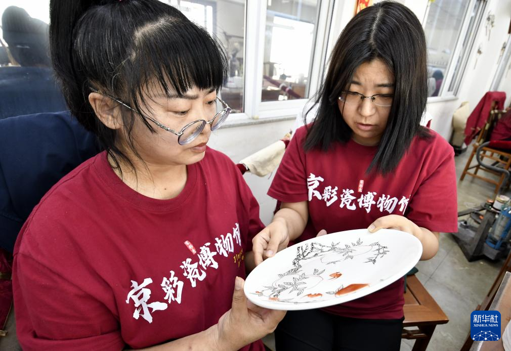 北京三级工艺美术大师、京彩瓷第五代传承人杨雪(左一)检验京彩瓷质量(6月18日摄)。