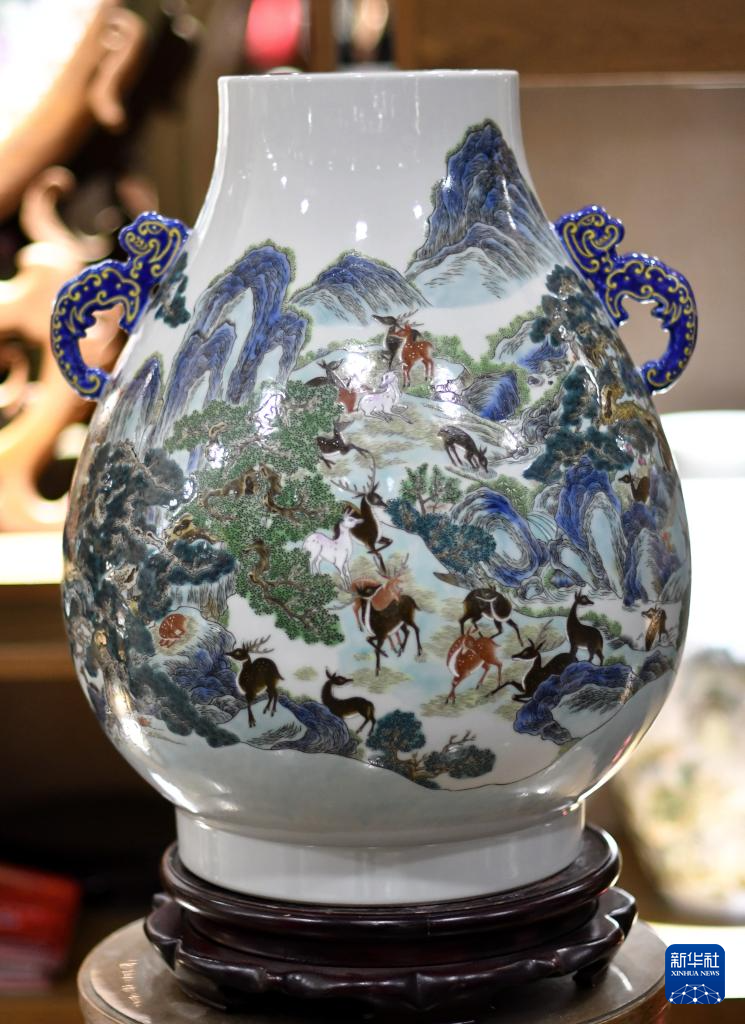 京彩瓷博物馆展示的京彩瓷珍品《粉彩百鹿尊》(6月18日摄)。