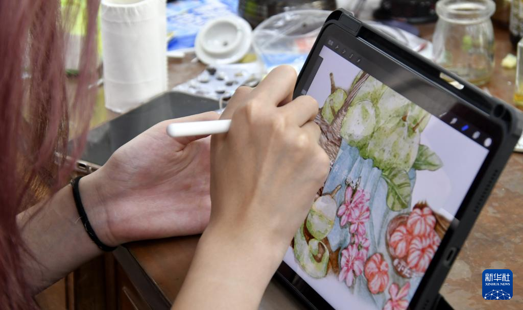 京彩瓷传承人王春艳进行釉上彩绘(6月18日摄)。