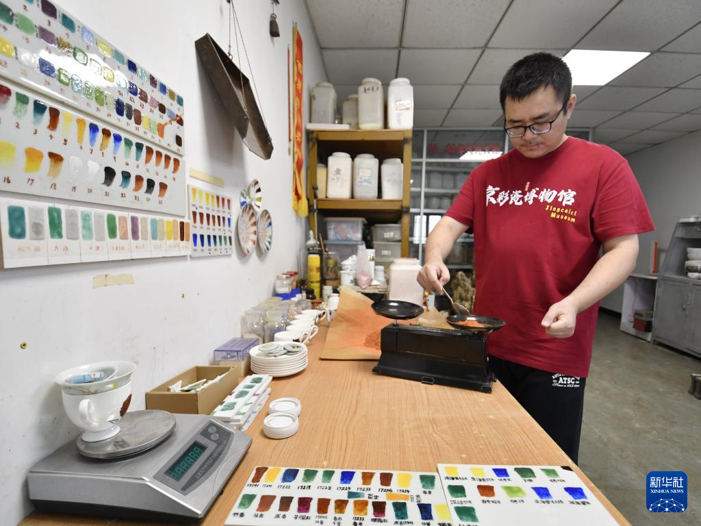 京彩瓷青年传承人刘宇帅进行釉色调配(6月18日摄)。