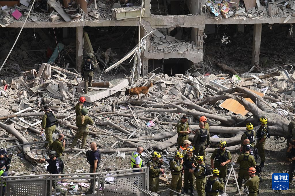 6月22日,在以色列中部特拉维夫的导弹袭击现场,应急和救援人员开展工作。