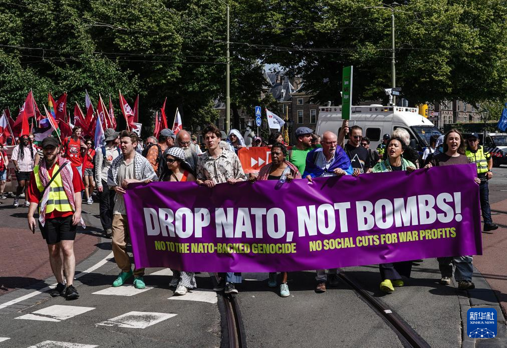 当日,数千名抗议者齐聚荷兰海牙库坎普森林公园,抗议两天后在海牙举行的北约峰会。此次峰会为期两天,与会领导人预计将就军费开支提升至国内生产总值(GDP)5%的提案达成协议。