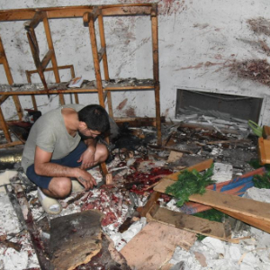 6月22日,一名男子蹲在叙利亚首都大马士革东部发生爆炸的教堂内。