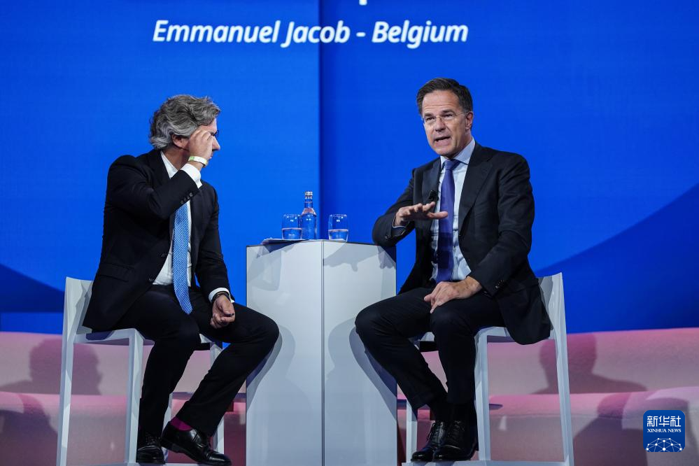 6月24日,在荷兰海牙,北约秘书长吕特(右)在北约公共论坛上讲话。