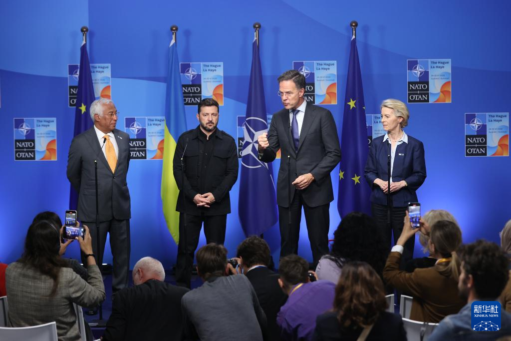 6月24日,在荷兰海牙,欧洲理事会主席科斯塔、乌克兰总统泽连斯基、北约秘书长吕特和欧盟委员会主席冯德莱恩(从左至右)在北约峰会期间共见记者。