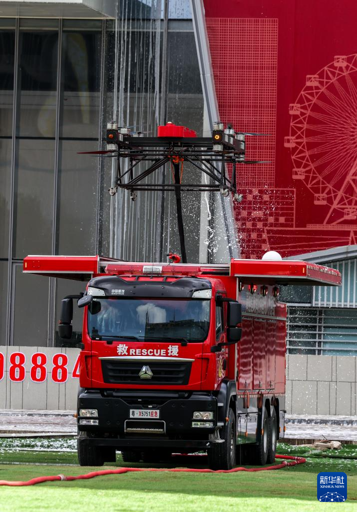 6月24日,在广东深圳的演习现场,山河星航系留无人机消防车参与演习。