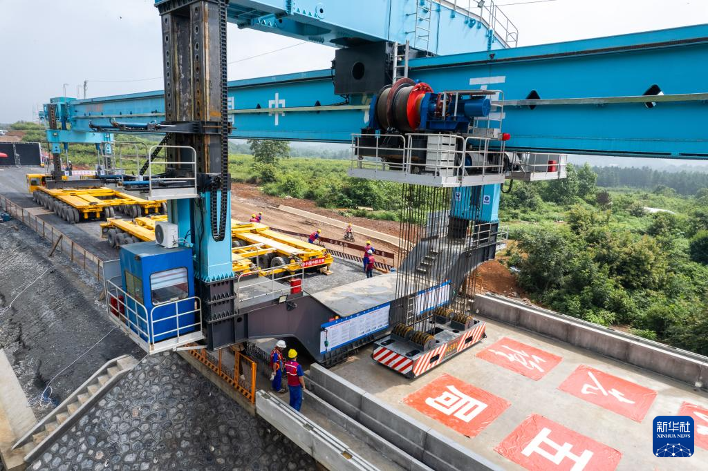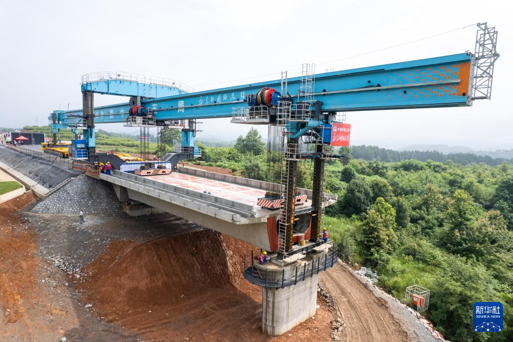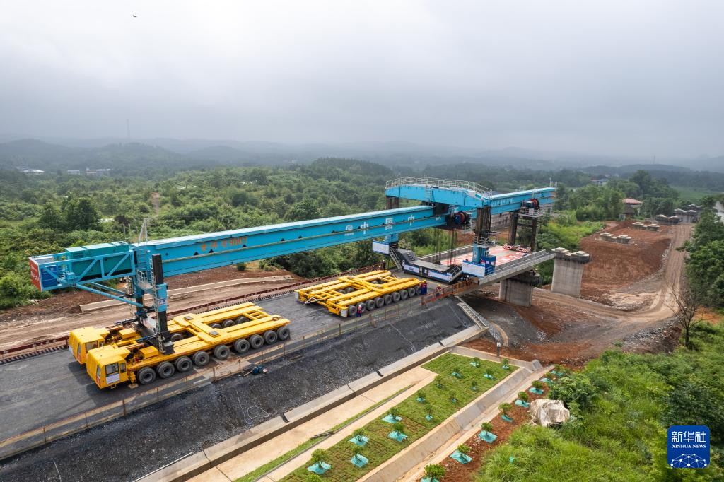 6月25日拍摄的邵永高铁柘刺坪特大桥架梁施工现场(无人机照片)。