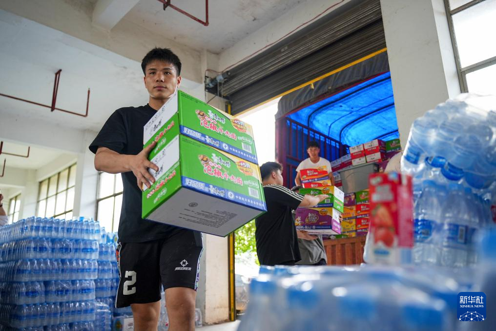 6月25日,林进标在贵州省榕江县工业园区搬运救援物资。