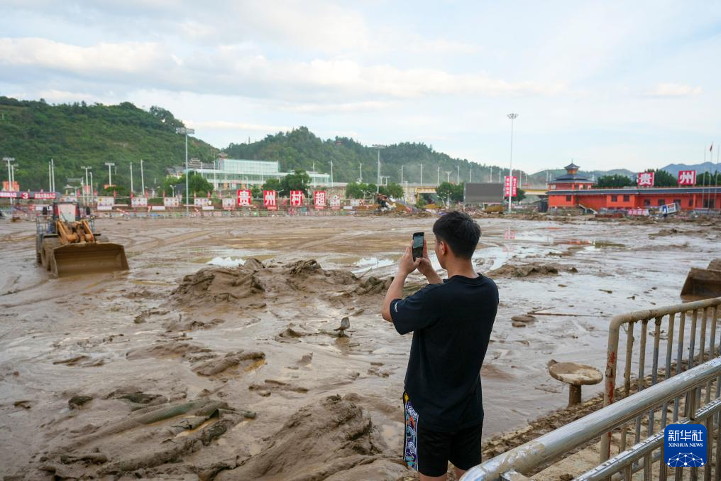 6月25日,林进标在贵州省榕江县“村超”球场拍摄洪水退后的场景。