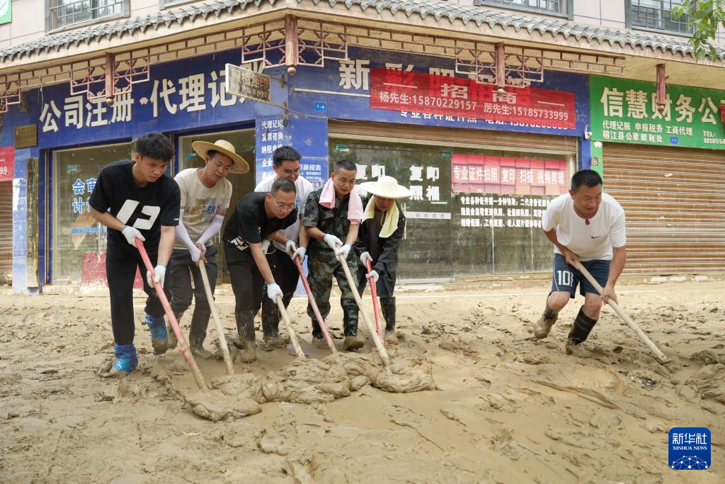 6月26日,林进标(左一)在贵州省榕江县新城区清淤。