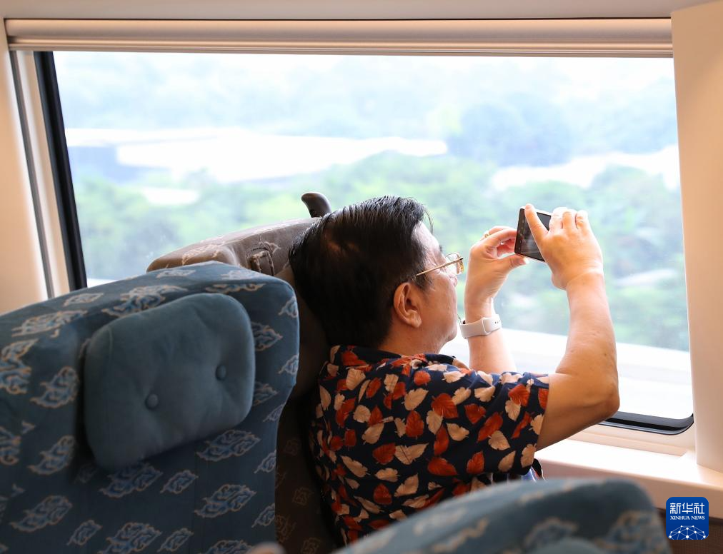 6月19日,一名乘客在行驶中的雅万高铁车厢内拍摄沿途风景。