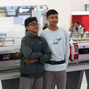 6月19日,在印度尼西亚雅加达,两名乘客在雅万高铁哈利姆站候车大厅与雅万高铁高速动车组模型合影。