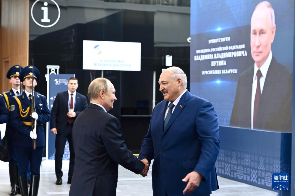 6月26日,在白俄罗斯明斯克,白俄罗斯总统卢卡申科(右)欢迎出席第四届欧亚经济论坛的俄罗斯总统普京(前左)。