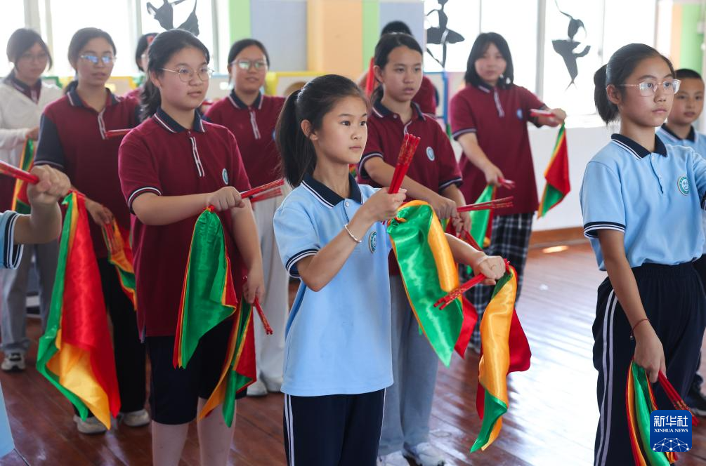 7月1日,东和乡中心学校的孩子们学习筷子舞。
