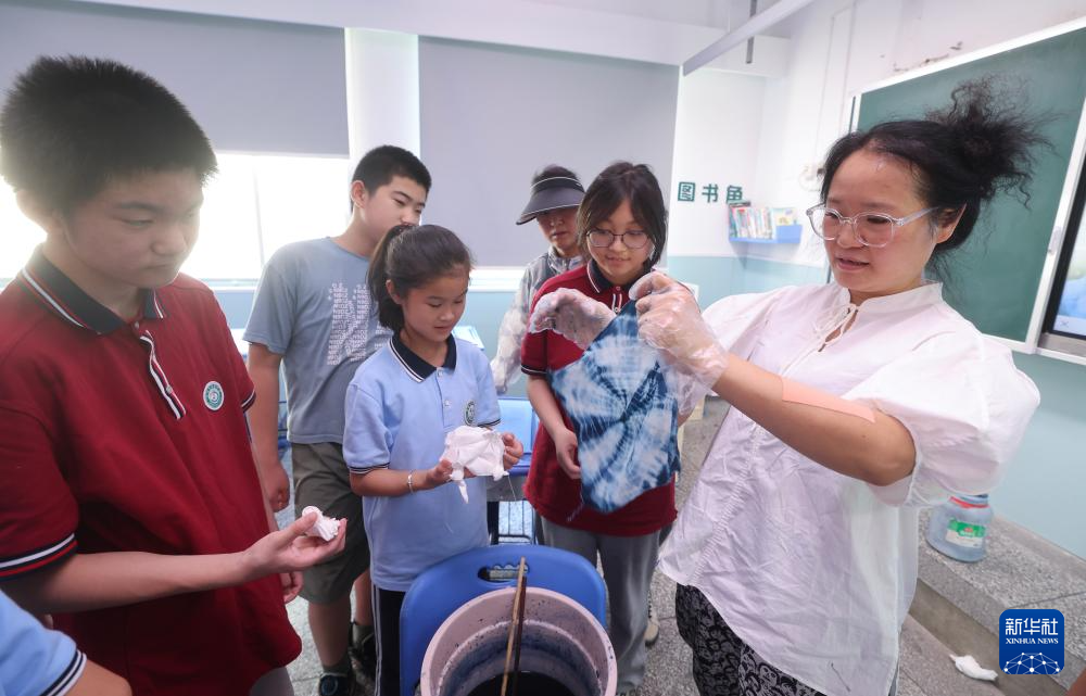 7月1日,诸暨市民族团结进步促进会的志愿者在东和乡中心学校教孩子们学习手工扎染。