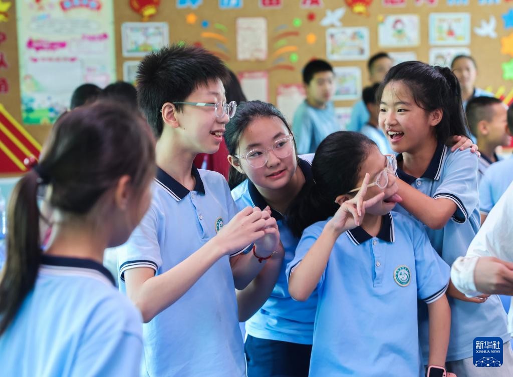 7月1日,东和乡中心学校的孩子们在进行互动游戏。