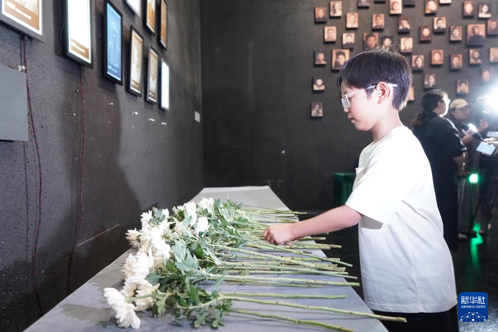 7月2日,离世幸存者刘贵祥的重外孙郭庭屹在活动现场献花。