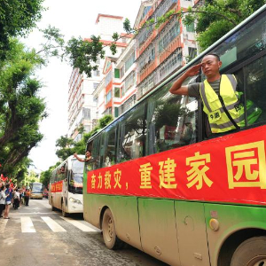 7月3日,在贵州省榕江县,完成任务的抗洪抢险救援队伍撤离时,救援队员、退伍军人陈通刚与路边送行的少先队员相互行礼。
